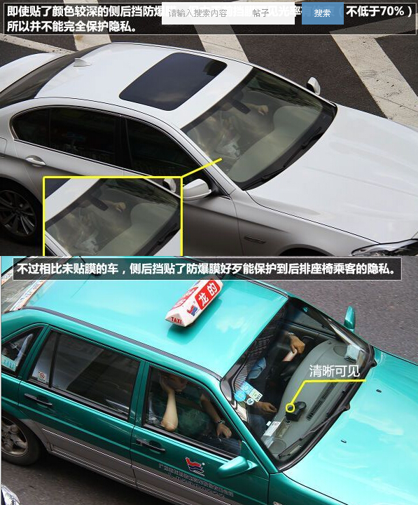 如果说利用前挡风玻璃膜来产生遮蔽作用可能性不会很大,那如果侧后挡风玻璃贴了颜色较深,透光率较低的隔热膜,是否又能产生保护隐私的作用呢?