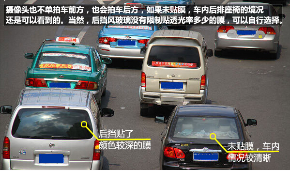 如果不好彩,车辆在摄像头前方被拍,车内情况还是有可能看清的,但探头的拍摄也不单单只拍摄正面,也会从车尾拍摄。说到这里,有车主可能会问,前挡膜规定了透光率必须在70%,能看清车内情况能够理解,但是没有规定后挡风玻璃不允许贴深色膜,如果贴了透光率较低、颜色较深的后档膜,是否可以规避隐私呢?